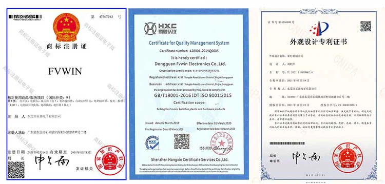 Naše podjetje pridobi blagovno znamko "FVWIN" in patente za našo osvetljeno taktno stikalo serije TS15.